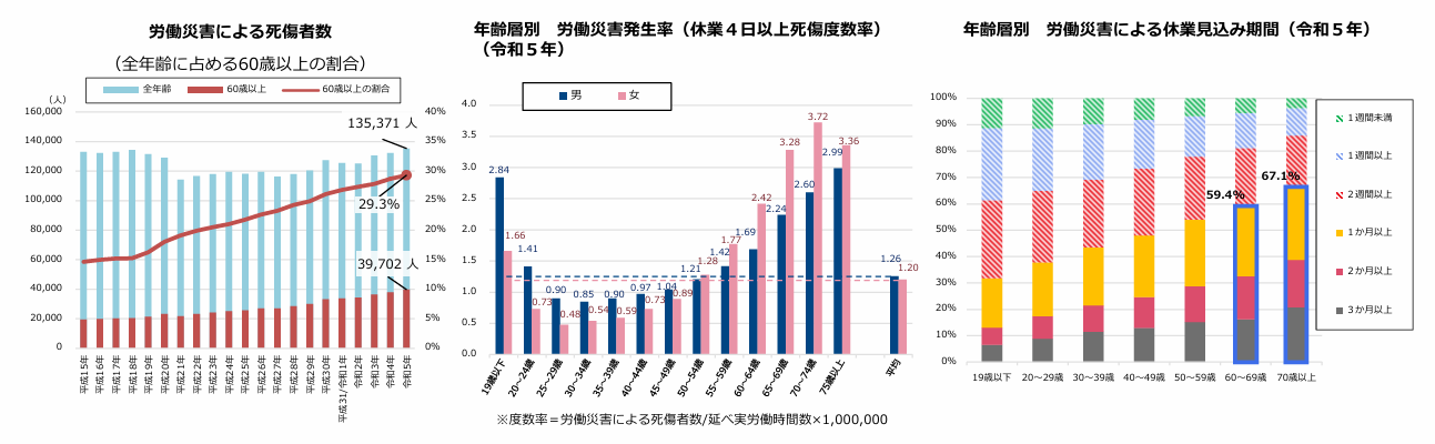 高年齢者は、長年の経験や知識という大きな強みを持つ一方で、身体機能の低下(視力・筋力・バランス能力など)による転倒や墜落といった労働災害のリスクが高まる傾向にあります。事実、高年齢労働者における労働災害発生率は他の世代と比較しても高く、労働災害による休業見込み期間も長いというデータが出ています。今回の指針は、こうした「高年齢者の特性」に配慮した職場づくりを事業者の努力義務として定めたものです。