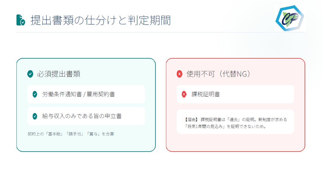 - 必要書類の変更:認定には「労働条件通知書等」と「給与収入のみである旨の申立」が必要となりますが、従前の取扱いとなる場合は引き続き課税証明書や給与明細での対応となります。