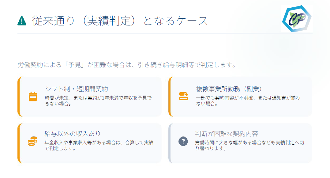 シフト制・短期間契約等への対応 通知書等に「シフト制による」とのみ記載され時間が不明確なケースや、契約期間が1年に満たないケースは、労働契約内容のみで年間収入を予見できないため、本制度の対象外となります。この場合も、直近の給与実績等に基づく従前の取扱いとなります。