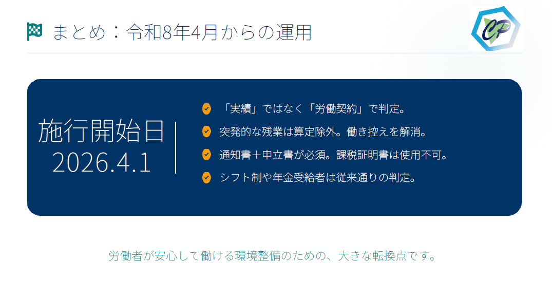 - 対象外のケース:シフト制で時間が未定の場合や、年金・事業収入等がある場合は、引き続き従前の取扱いが適用されます。